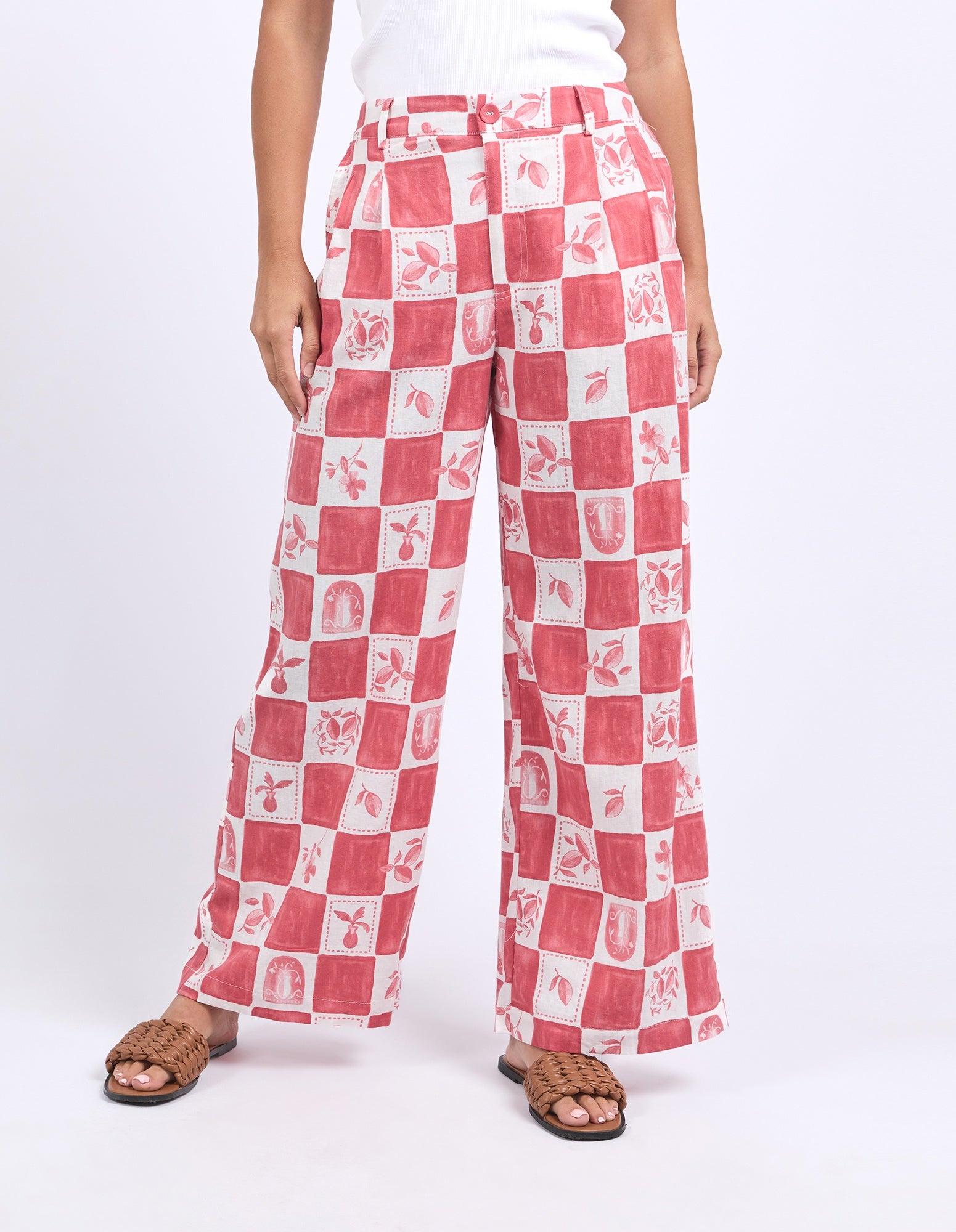 A relaxed pant with a flat front and elastic waist with side seam pockets in an exclusive Foxwood print.